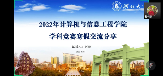 1月24日,何鹏老师围绕蓝桥杯、中国大学生服务外包创新创业大赛、中国高校计算机大赛-团体程序天梯赛等3个比赛,介绍赛事基本内容、知识储备、备赛方法、组队注意事项等内容,针对不同年级、不同竞赛背景的同学提供竞赛指导意见。