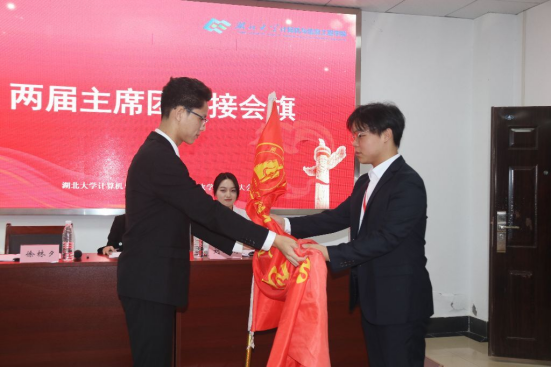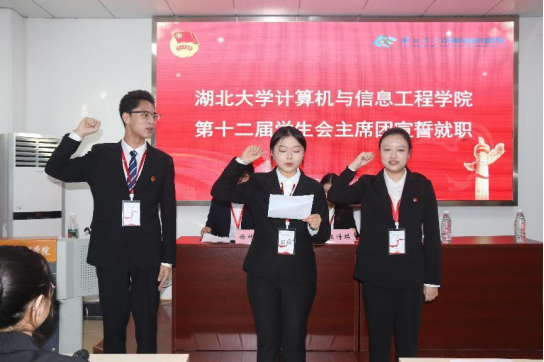 在第四次全体会议暨闭幕式上,新当选的伟德国际victor1946计算机与信息工程学院第十二届学生会主席团成员郑重完成会旗交接,并庄严宣誓。