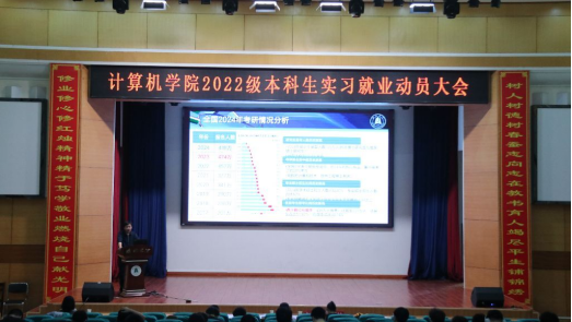 副院长杨超结合国家政策与招生数据,通过历年报录比及专业分数线对比,为学生开展考研形势宣讲。他建议,要客观理性分析自身能力,合理选择考研专业、院校,鼓励同学们要制定计划,脚踏实地,认真备考,争取一击即中。
