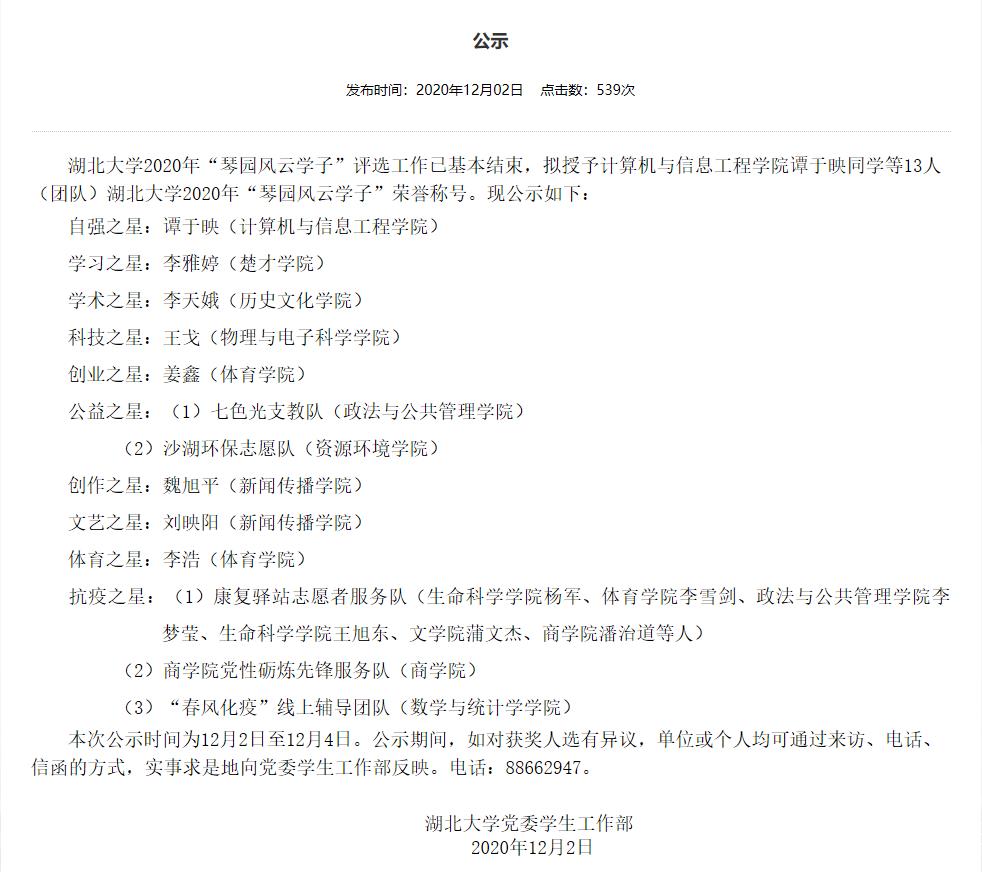 据悉,本次琴园风云学子”评选活动旨在,希望学生树立远大理想,专于学习、勤于实践、勇于创新,不断提升自身综合素质,努力成长为担当民族复兴大任的时代新人。