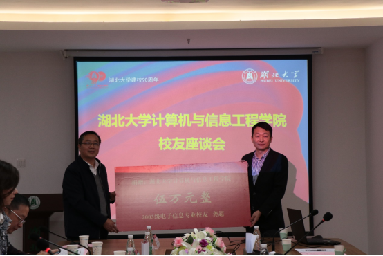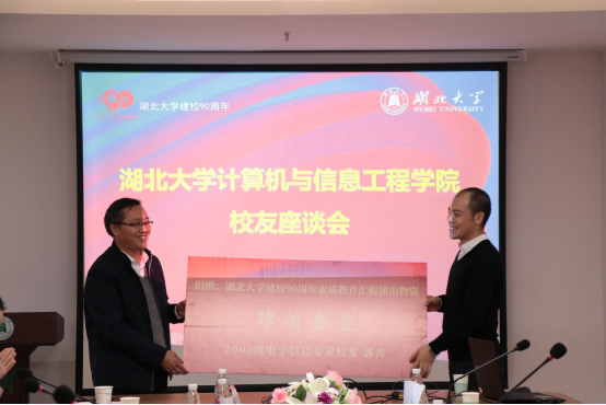 随后,院党委书记秦明君分别向捐赠了400套用于伟德国际victor1946建校90周年素质教育汇报演出美妆工具的2003级电子信息专业校友郭涛和5万元用于学生实验电子板的2003级电子信息专业校友龚超颁发了捐赠纪念牌。