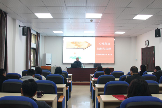 接下来,杨子云以《大学生心理危机觉察及应急处理方案》为主题给班主任开展专题心理讲座。他用接触过的多个学生为例,依次从如何发现鉴别、评估诊断、治疗干预、康复适应四个过程进行了细致入微地讲解。他表示,班主任要积极主动的,通过各种方式去了解学生心理状况,当遇到需要帮助的学生,班主任、学校、家庭、专家队伍、校外机构需要多方联动,抱着让学生更幸福、成功的生活,更自尊、自信、自由的目标,使用包括家庭资源、专业资源以及教学资源在内的各方面的资源,与学生进行心灵感情的沟通,与家长建立合作关系,以成长性目标统合回避性目标,共同帮助学生克服难题、健康成长。