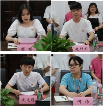毕业生党员代表胡蝶、赵轩然、安先跨、何炜等四位同志依次发言,他们分享了大学四年的学习与体会,从考研、保研、就业等方面给学弟学妹传授经验。在互动交流环节,毕业生党员从课程设置、导师互动等等方面提出意见和建议,老师们对相关问题逐一回应。
