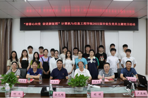为深入开展下基层察民情解民忧暖民心实践活动,积极做好毕业生教育工作,进一步加强对毕业生党员的教育、管理和服务,强化毕业生党员的身份意识,计算机与信息工程学院党委于6月8日下午,在学院201会议室以“青春心向党 奋进新征程”为主题召开2022届毕业生党员党日活动,学院党委副书记邓睿智、副院长杨维明、学院各支部书记、应届毕业生党员代表及新党员代表参加活动。院党委副书记邓睿智主持活动。