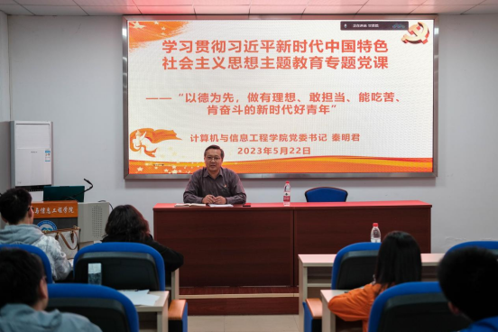 为进一步发挥学院领导班子在学习贯彻习近平新时代中国特色社会主义思想中的“头雁”作用,根据学院主题教育读书班方案要求,学院党委委员走进联系党支部开展“委员督学”,推进主题教育走深走实。5月22日晚,学院党委书记秦明君参加本科生第三党支部5月主题党日活动,在支部开展主题教育专题学习环节,为党支部师生讲授题为“以德为先,做有理想、有担当、能吃苦、肯奋斗的新时代好青年”的专题党课,支部书记彭菊红主持活动。